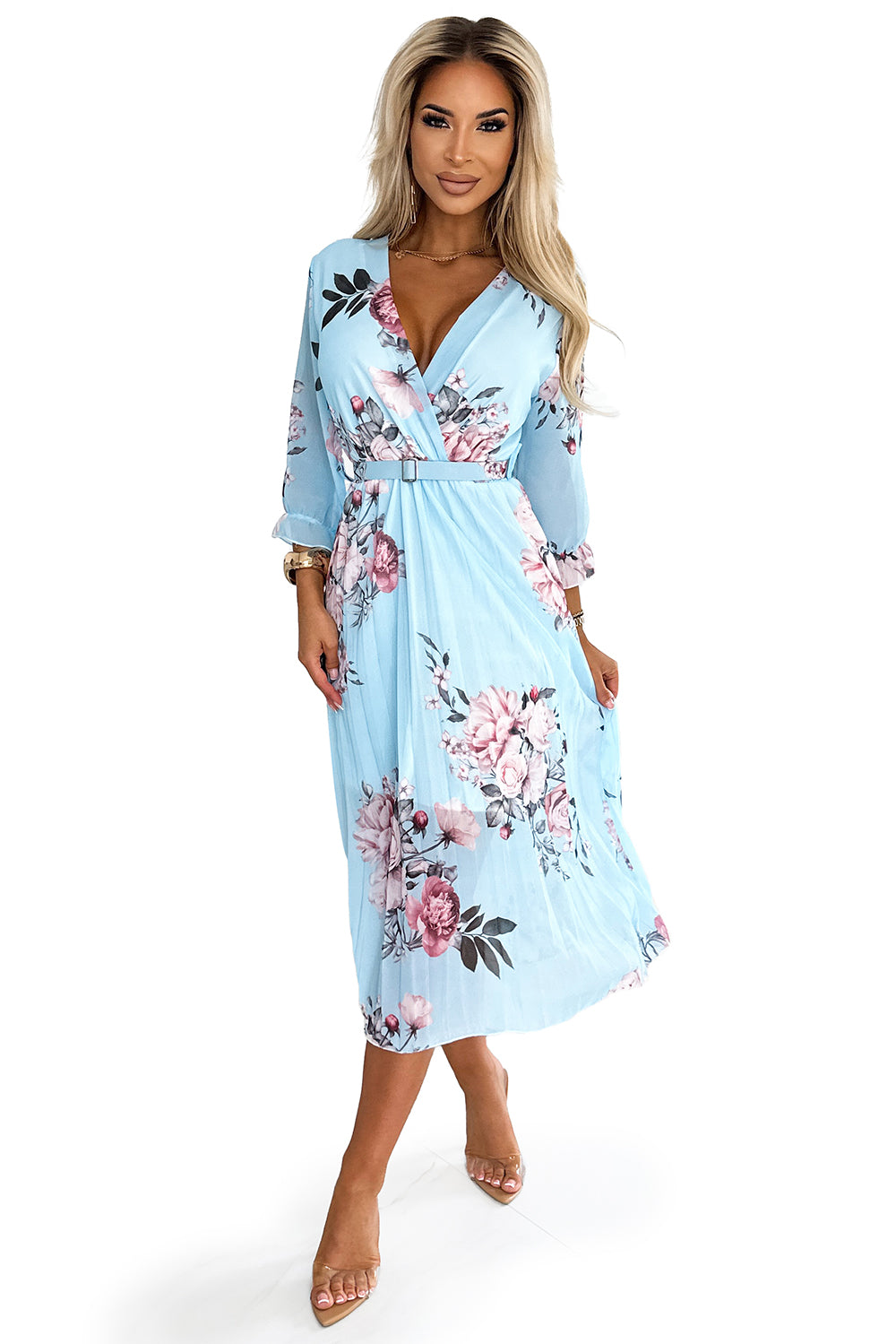 448-3 YUNA Pleated midi dress with a neckline and a belt - roses on a blue background