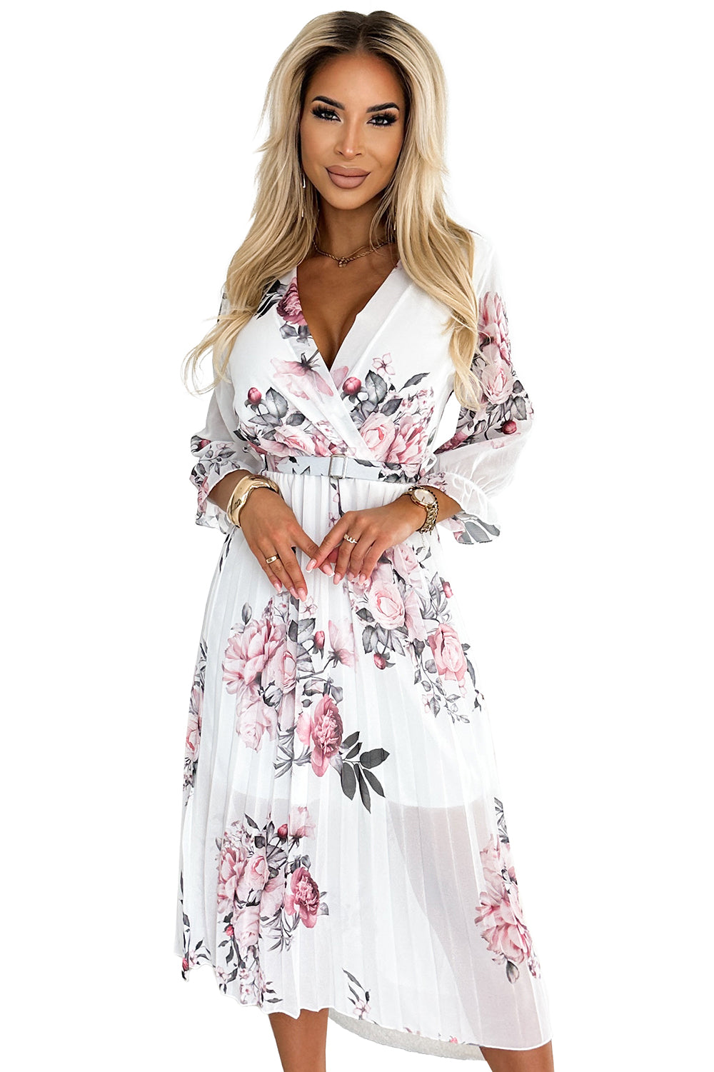 448-2 YUNA Pleated midi dress with a neckline and belt - roses on a white background